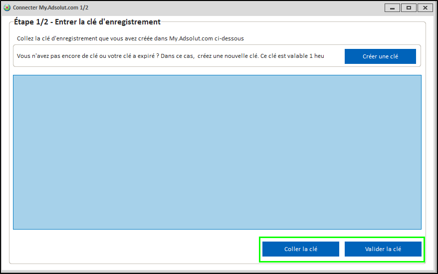 Collez ici la clé d'activation que vous avez créée sur My.Adsolut.com en cliquant sur le bouton Coller la clé.