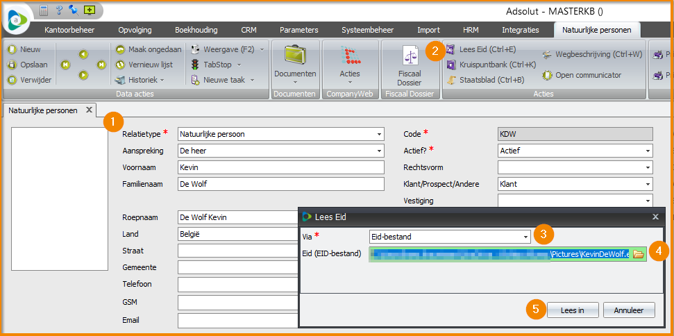 Voor elke relatiefiche van een natuurlijke persoon met een in België uitgereikte identiteitskaart (die een chip bevat) kan Adsolut de gegevens (die het programma van op de kaart mag lezen) overbrengen naar het tabblad Identificatie. Dat geldt eveneens voor de foto en het identificatiedocument in het document management systeem (DMS).