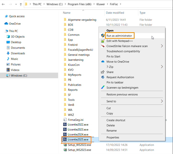 - In deze folder klikt u met de rechtermuisknop op het installatiebestand Licentie2025.exe en selecteert de functie Als administrator uitvoeren (Run as administrator).