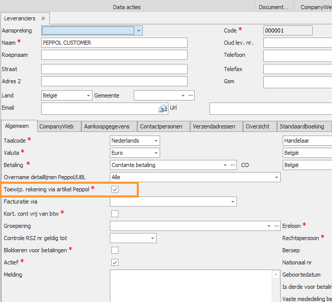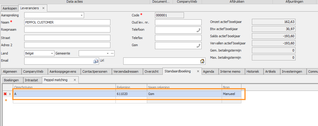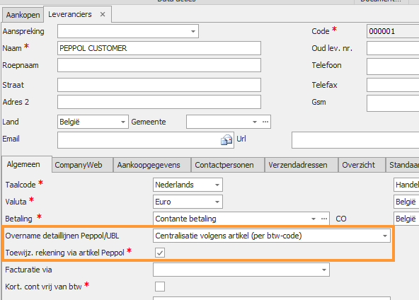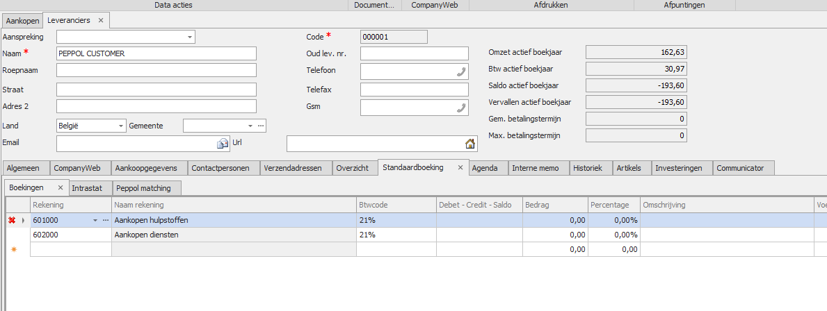 Indien het vinkje 'Toewijz. rekening via artikel Peppol' wordt uitgezet op de leverancier of als de dossier setting is ingesteld op 'Geen', dan wordt de standaardboeking terug gebruikt.