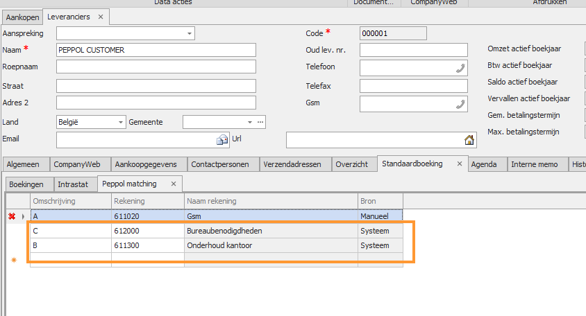 Bij het opslaan van de factuur worden er nieuwe regels toegevoegd aan de Peppol matching. Dit zowel op de leveranciersfiche als in de parameters.