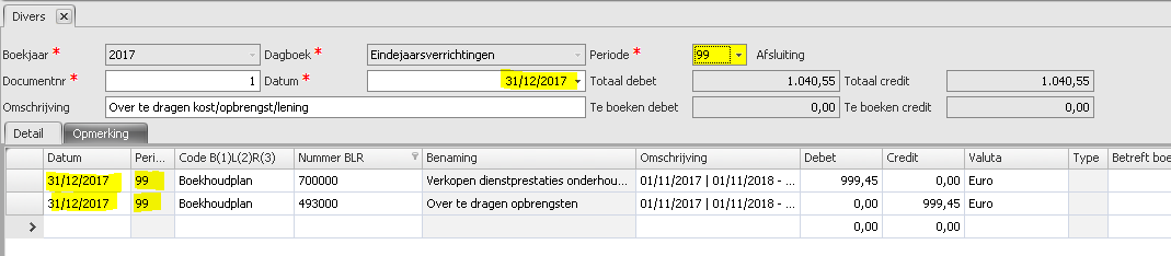 - datum boeking : de laatste dag van het boekjaar wordt gebruikt