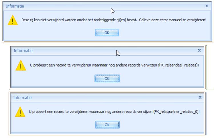 Wanneer een relatie gekoppeld is aan andere gegevens binnen het systeem, kan dit het verwijderen ervan verhinderen. Enkele mogelijke oorzaken: