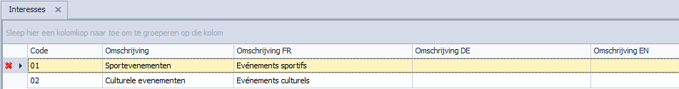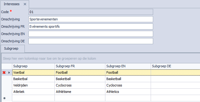 Bij het aanmaken van een nieuwe interessegroep kiest u zelf de code en geeft u de omschrijving in. Vervolgens geeft u in de onderste grid de subgroepen op die bij deze interesse horen.