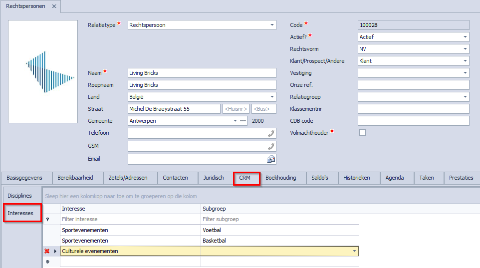 Indien u volgens uw licentiesleutel toegang heeft tot de CRM-module van Adsolut Kantoorbeheer dan verschijnt er in de relatiefiche onder het tabblad ‘CRM’ een extra subtab ‘Interesses’: