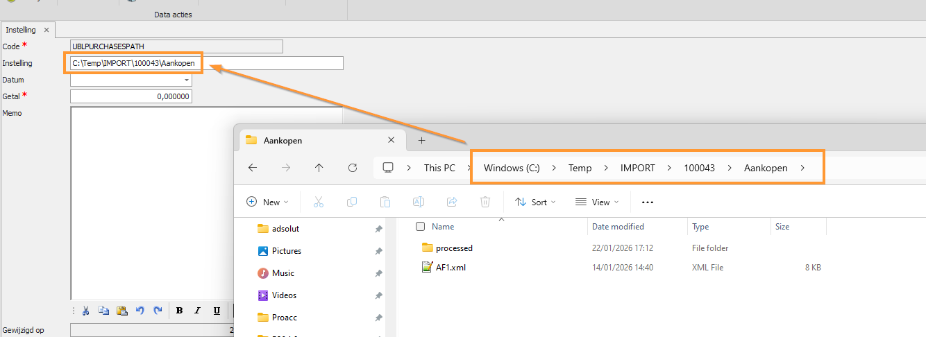 De locatie stel je per dossier in onder Systeembeheer > Instelling > UBLPURCHASESPATH.