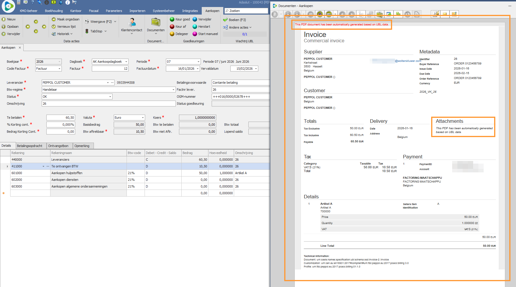 Je zult een boekingsvoorstel krijgen met een gegenereerd beeld van de factuur op basis van de gegevens uit het XML-bestand.