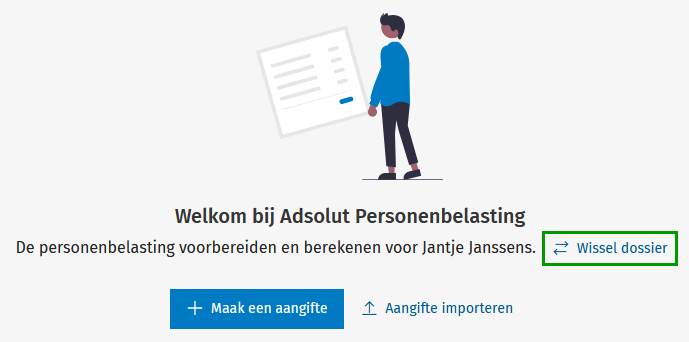 Klik op Wissel dossier in het midden van het scherm of klik rechtsboven op de naam van het huidige dossier om een nieuw dossier toe te voegen.