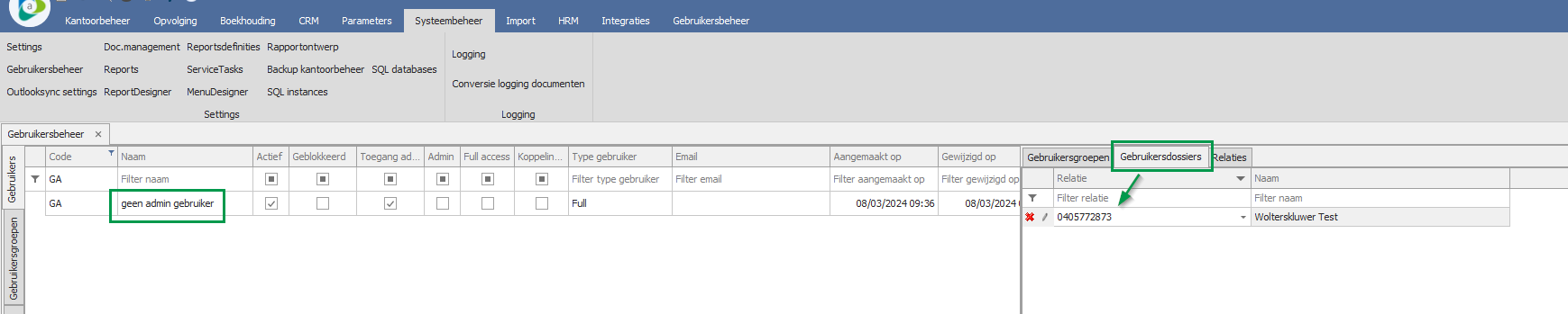 Indien u enkel 1 gebruiker toegang wilt geven tot 1 dossier, kan u dit op gebruikersniveau instellen
