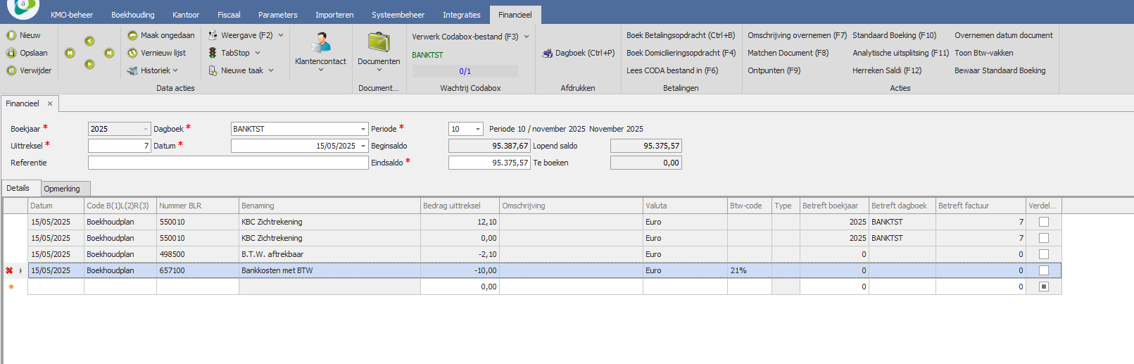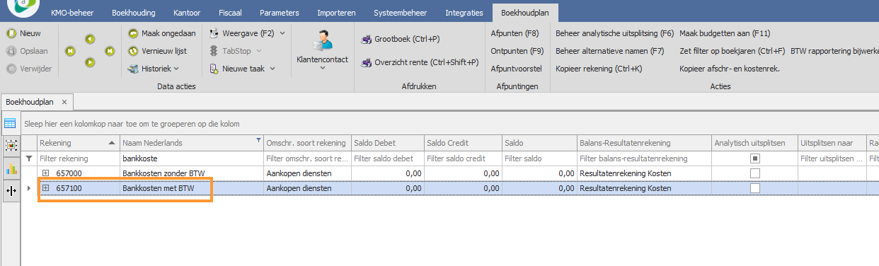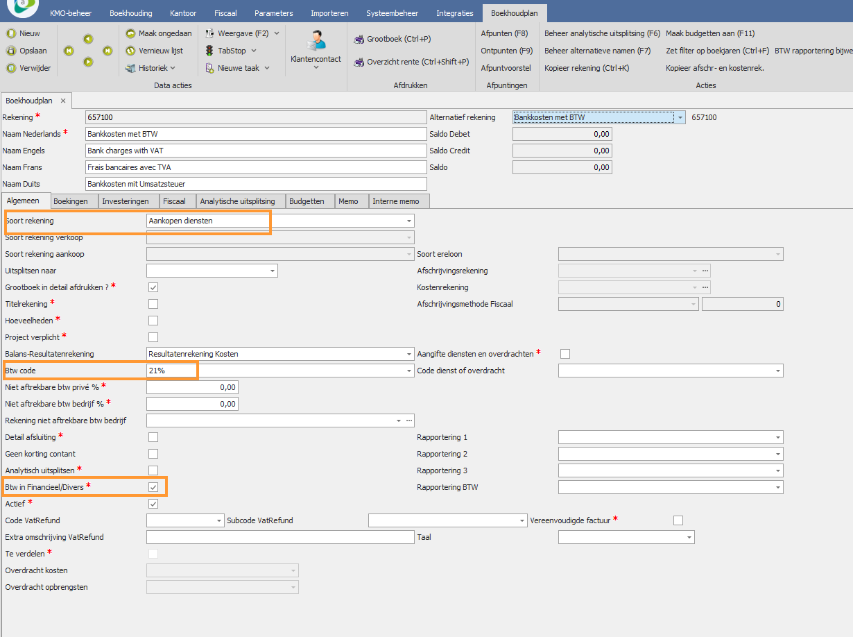 Boekhouding::Boekhoudplan en open de rekening voor de bankkosten inclusief BTW. Bv. rkening 65... bankkosten (inclusief btw)