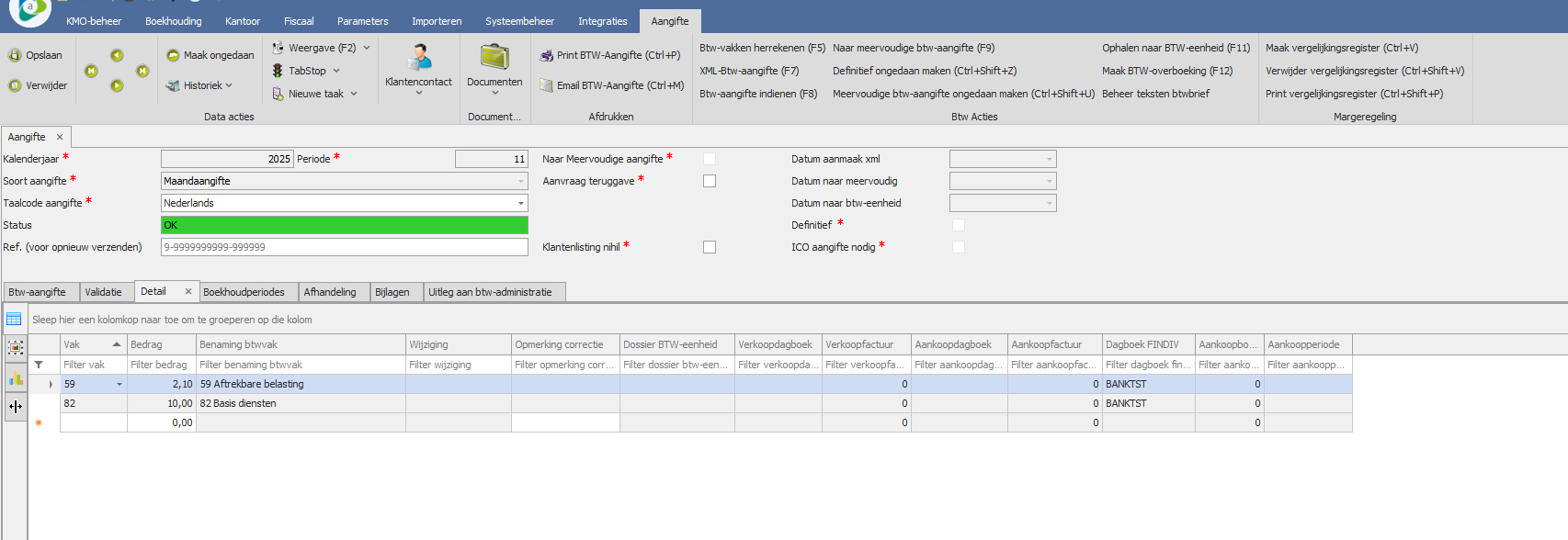 Open betreffende aangifte en filter in het tabblad 'Detail' op vakken 82/59 of dagboek FINDIV = betreffende bankdagboek: