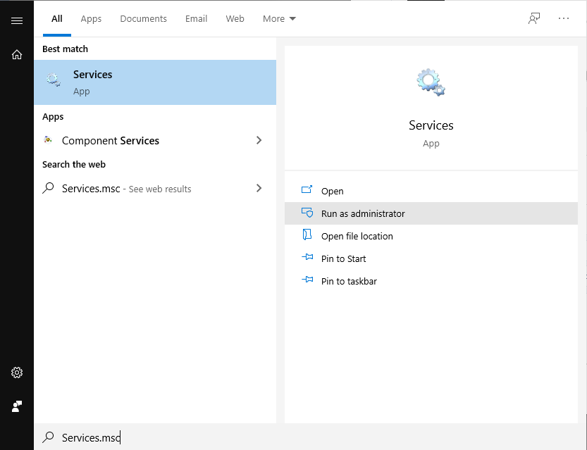 - Tik in het zoekveld Services.msc en voer dit uit als administrator.