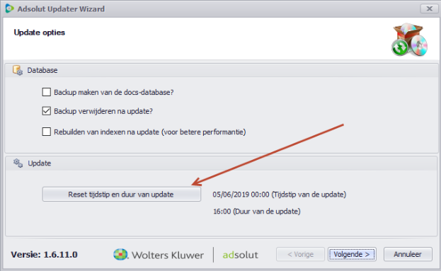 Bij het manueel opstarten van de Update Wizard heb je wel de mogelijkheid om de eerder ingestelde datum te resetten.