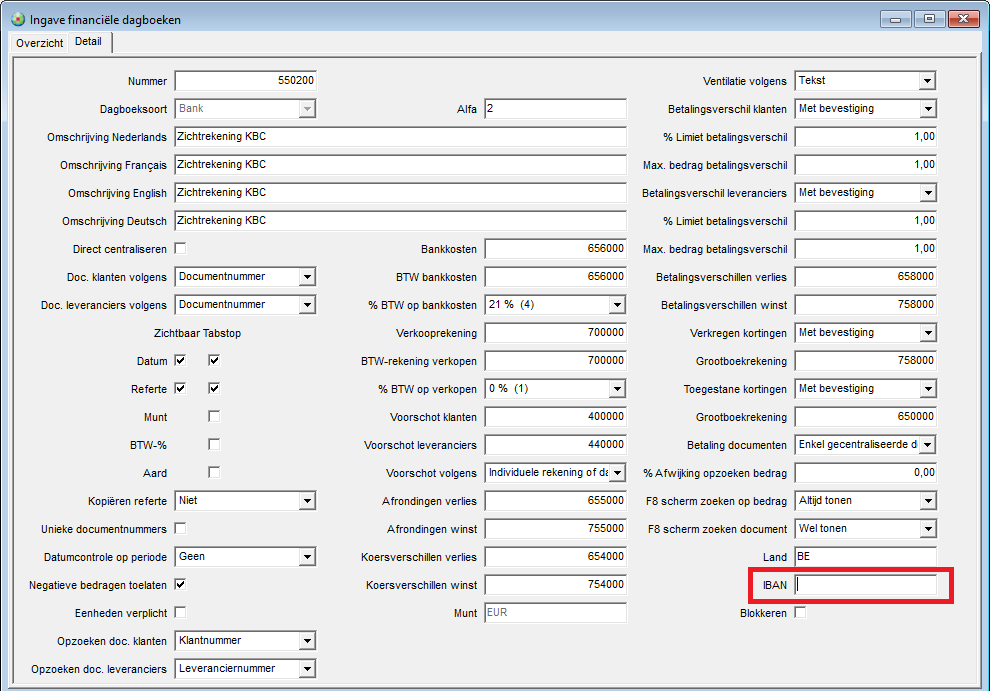 Concreet: Het veld 'IBAN' in de basisgegevens van het financieel dagboek ('Ingave, Basisgegevens, Financiële Dagboeken') moet een waarde bevatten die overeenkomt met het IBAN-nummer dat opgenomen is in de te importeren CODA-bestanden.