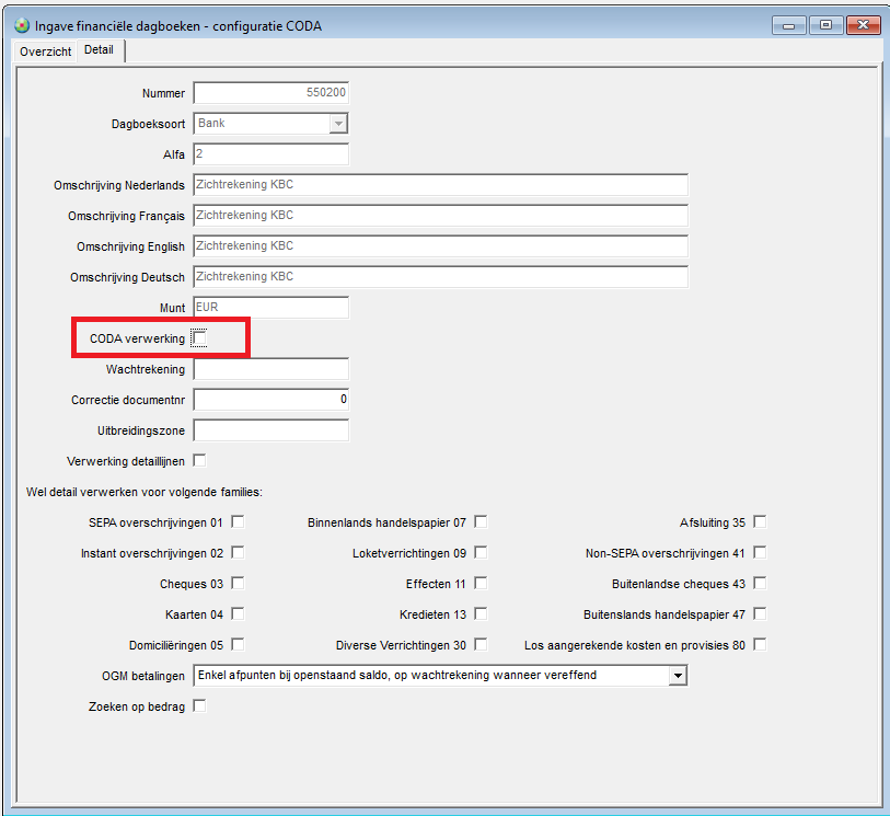 Concreet: In het menu "Dagboeken, CODA, Configuratie CODA" moet het veld "CODA-verwerking" voor het betrokken financieel dagboek aangevinkt zijn om er Coda-bestanden in te kunnen verwerken.