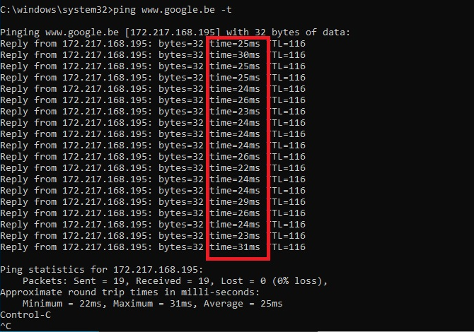Laat een ping-test lopen gedurende een langere tijd (bv. 30 minuten) met het volgende commando in de opdrachtprompt: