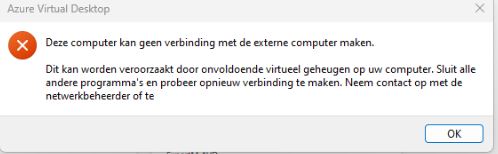 De foutmelding op de afbeelding geeft aan dat de computer geen verbinding kan maken met de externe computer vanwege onvoldoende virtueel geheugen.
