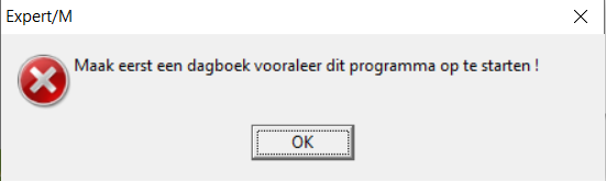 - Het betreft een nieuwe Expert/M-dossier waarin er nog geen dagboeken aangemaakt zijn. In dit geval zal u bij het manueel openen van het menu 'Dagboeken, Aankopen, Ingave aankopen' en/of 'Dagboeken, Verkopen, Ingave verkopen' de melding 'Maak eerst een dagboek vooraleer dit programma op te starten!' verkrijgen. In dit geval volstaat het om de betrokken dagboeken aan te maken via het menu 'Ingave, Basisgegevens, Aankoop/Verkoopdagboeken' om het probleem te verhelpen.