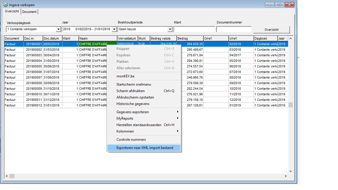 Let wel op, alle facturen in het overzicht scherm zullen opgenomen worden in het XML-bestand.
