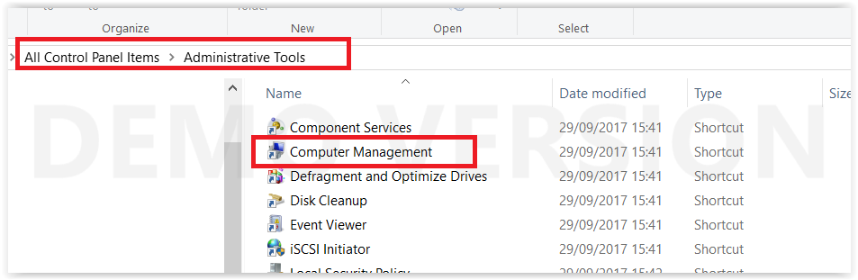3. Open het lokale Computerbeheer ('Configuratiescherm (Control Panel), Systeembeheer (Administrative Tools), Computerbeheer (Computer Management)').