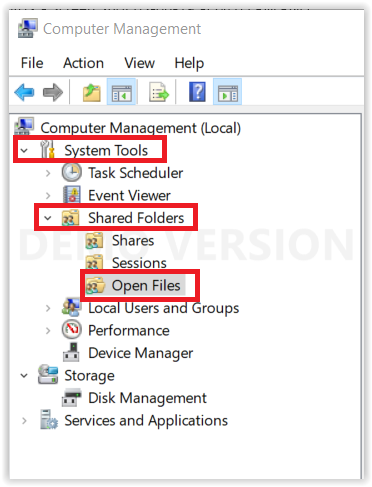 4. Open in de boomstructuur links het menu 'Systeemwerkset (System Tools), Gedeelde Mappen (Shared Folders), Geopende Bestanden (Open Files)'. Hierdoor ziet u in het venster rechts de bestanden vermeld staan die geopend zijn.