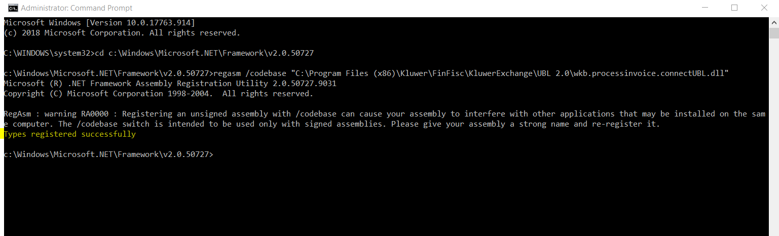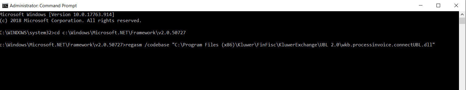 c:\Windows\Microsoft.NET\Framework\v2.0.50727>regasm /codebase uit te voeren op het bestand 'wkb.processinvoice.connectubl.dll' uit de folder '?:\Kluwer\Finfisc\KluwerExchange\UBL2.0\' (Het vraagteken moet vervangen worden door de effectieve locatie waarin deze folder terug te vinden is. In onderstaand voorbeeld is dit 'C:\Program Files (x86)\')