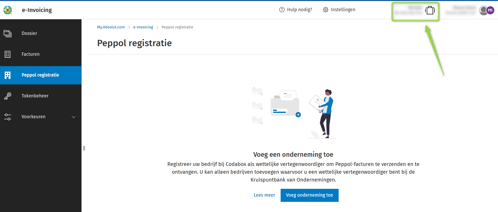 Controleer rechtsboven in de dossierwisselaar (of in Dossiers) of het correcte dossier is geselecteerd. Het is voor dit dossier dat de onderneming wordt geregistreerd. Zie: Hoe beheer ik mijn dossiers op het nieuwe e-invoicingportaal (2025)?