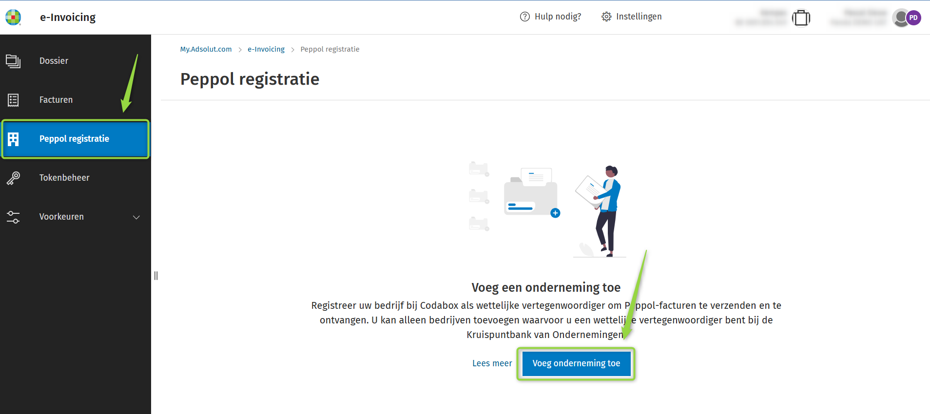 De onderneming in wiens naam voor een bepaald dossier elektronische facturen op het e-invoicingportaal worden verstuurd en/of ontvangen moet worden geregistreerd bij Codabox.