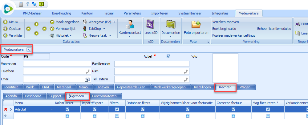 - Open de detailfiche van de werknemer waarvoor u rechten gaat toekennen en ga naar het Tabblad Rechten > Algemeen.