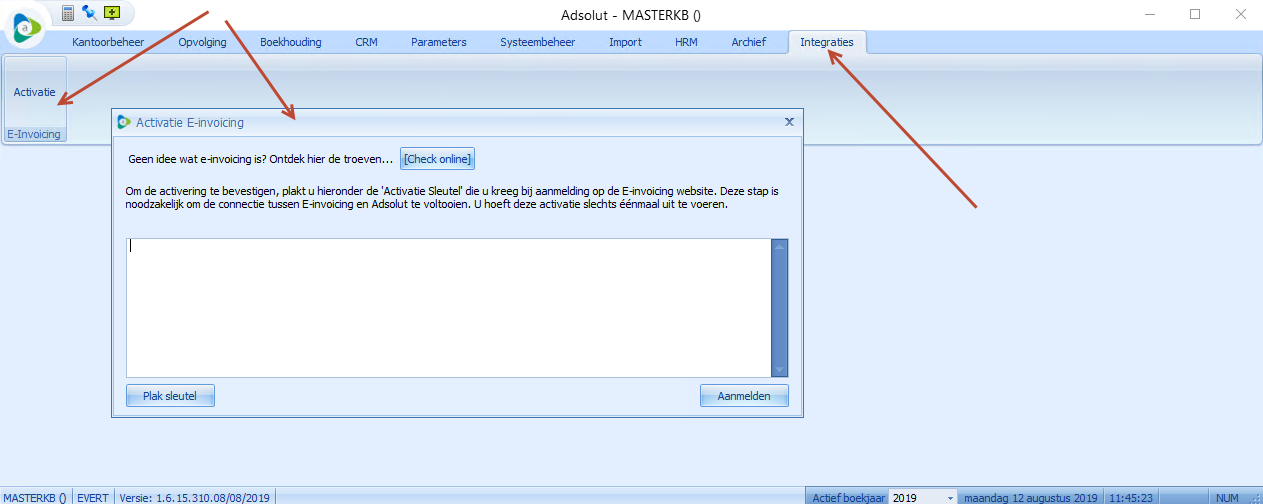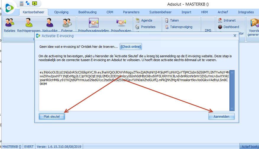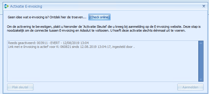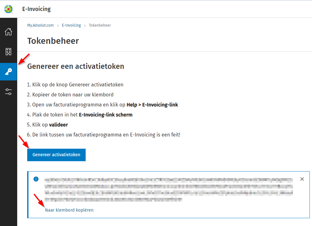 - Ga terug naar het scherm Activatie e-invoicing in Adsolut en plak deze token om de koppeling te maken met het e-invoicingportaal.