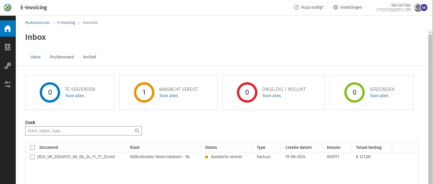 Wanneer u het e-invoicingportaal activeert voor 1 dossier is de activatie automatisch actief voor de ganse Adsolut instantie.