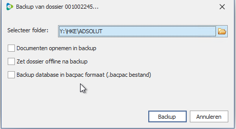 Wij raden aan om de Adsolut-sessie actief te houden zolang de back-up loopt, of eventueel de documenten niet mee op te nemen in de back-up (deze hebben het grootste aandeel in de backup).
