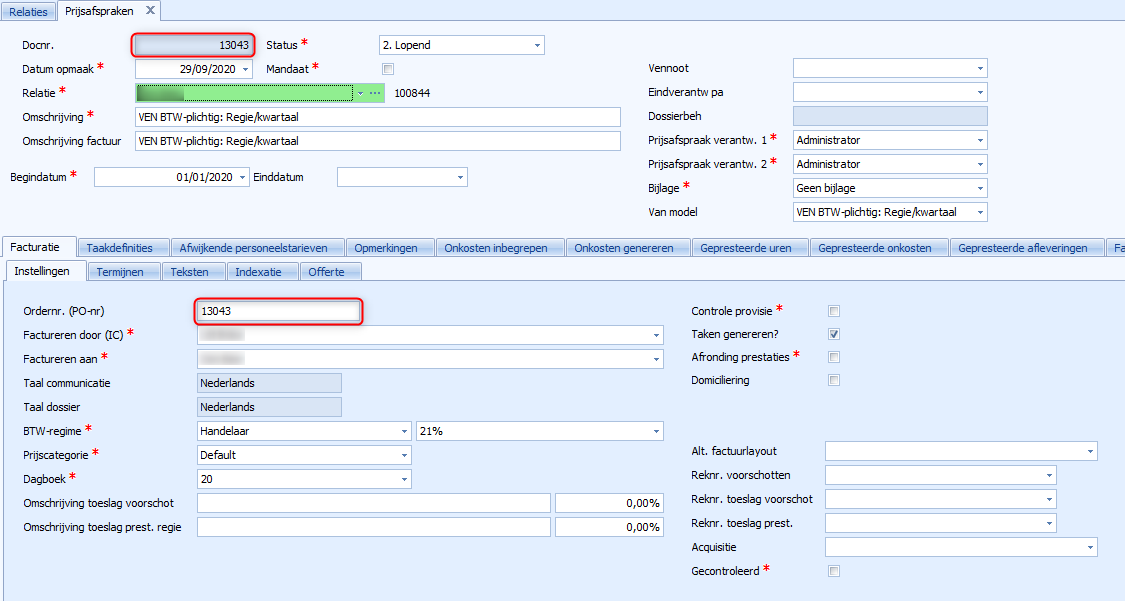 Wij raden u aan om het Documentnummer van de prijsafspraak van die klant in te vullen in het veld Ordernr. (PO-nr) op het tabblad Facturatie, Instellingen.
