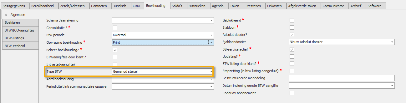 In het MASTERKB > Kantoorbeheer > Relaties > Tabblad 'Boekhouding' > Tabblad 'Algemeen'