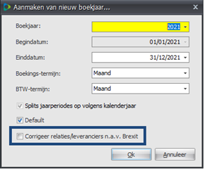 Dit hulpprogramma kan op 2 manieren uitgevoerd worden. 1. Via het aanmaken van een nieuw boekjaar (begindatum vanaf 01/01/2021) 2. Manueel (via Importeren – Brexit conversie) U kan zelf bepalen, afhankelijk van het dossier, wanneer u de omzetting wenst uit te voeren. Indien u ervoor koos om de omzetting te doen bij het aanmaken van het boekjaar en u geeft nog een nieuwe relatie of leverancier in voor 01/01/2021 met land Verenigd Koninkrijk, dan zal nog steeds het BTW regime ‘Intracommunautair’ worden toegepast. Deze relaties en leveranciers kan u nadien zonder problemen omzetten met het hulpprogramma onder het menu ‘Importeren’ (optie 2) U kan m.a.w. meermaals het hulpprogramma uitvoeren.