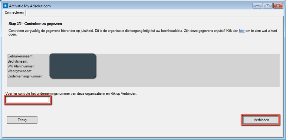 7. Als het ondernemingsnummer succesvol gevalideerd wordt, klikt u op Verbinden.