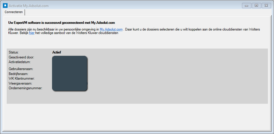 Als u later opnieuw naar Configuratie > Connecteer My.Adsolut.com gaat, dan krijgt u de koppelingsbevestiging met een samenvatting van de koppelingsgegevens te zien.