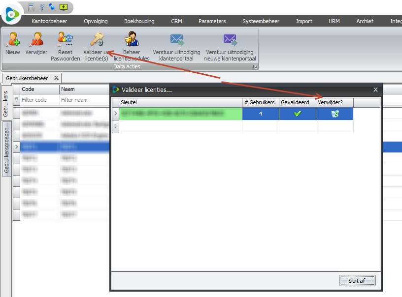 Valideer licentie(s) 5. Selecteer de licentiesleutel die u wenst te verwijderen