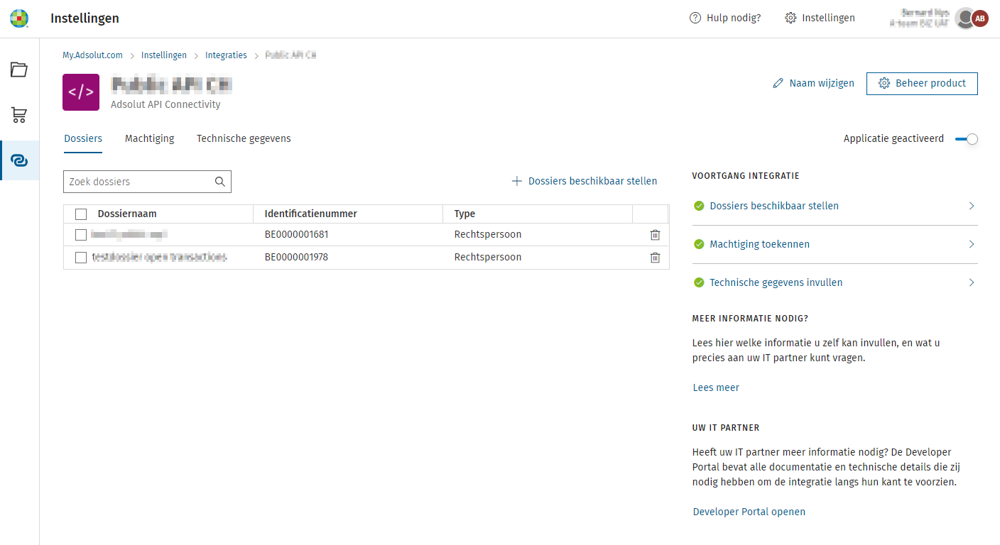 Ga naar Integraties, Adsolut API Connectivity om de dossiers te selecteren die u voor deze partner wilt beschikbaar maken.