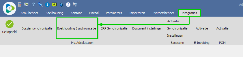 - Open in Adsolut het dossier waarvan u de data op My.Adsolut.com wilt beschikbaar stellen, b.v. voor gebruik van Basecone. Ter info: deze handeling moet voor elk gewenst dossier herhaald worden.