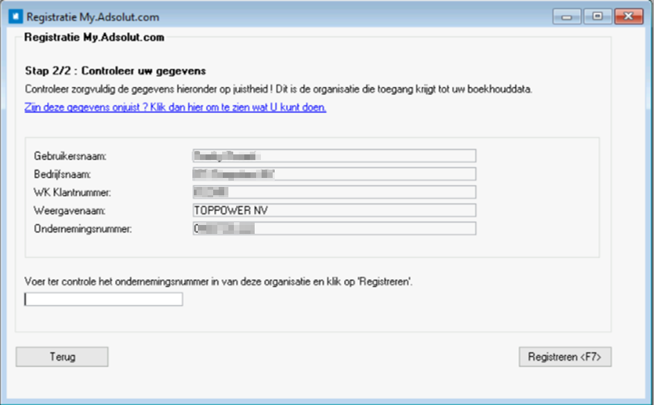 Als controlemaatregel wordt nog gevraagd om in het volgende scherm het ondernemingsnummer van uw organisatie in te vullen.