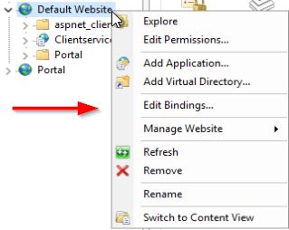 8. Ga terug naar de websites en "Edit bindings" van de "Default Website".