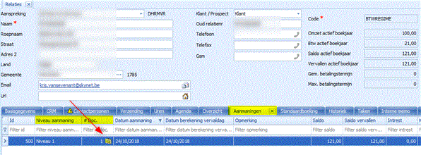 Via Boekhouding > Relaties > tabblad aanmaningen. In het voorbeeld hieronder is er nog maar één aanmaning die verstuurd werd: dat zien we aan de kolom niveau aanmaning.