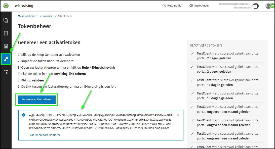 Naast het koppelen van uw Wolters Kluwer software met My.Adsolut.com en het synchroniseren van de dossiers uit uw Wolters Kluwer software met My.Adsolut.com is het tot slot ook nodig om uw Wolters Kluwer software te koppelen aan het e-invoicingportaal. Dit gebeurt door een beveiligingssleutel (token) aan te maken op het e-invoicingportaal die u daarna kunt plakken in uw Wolters Kluwer software.