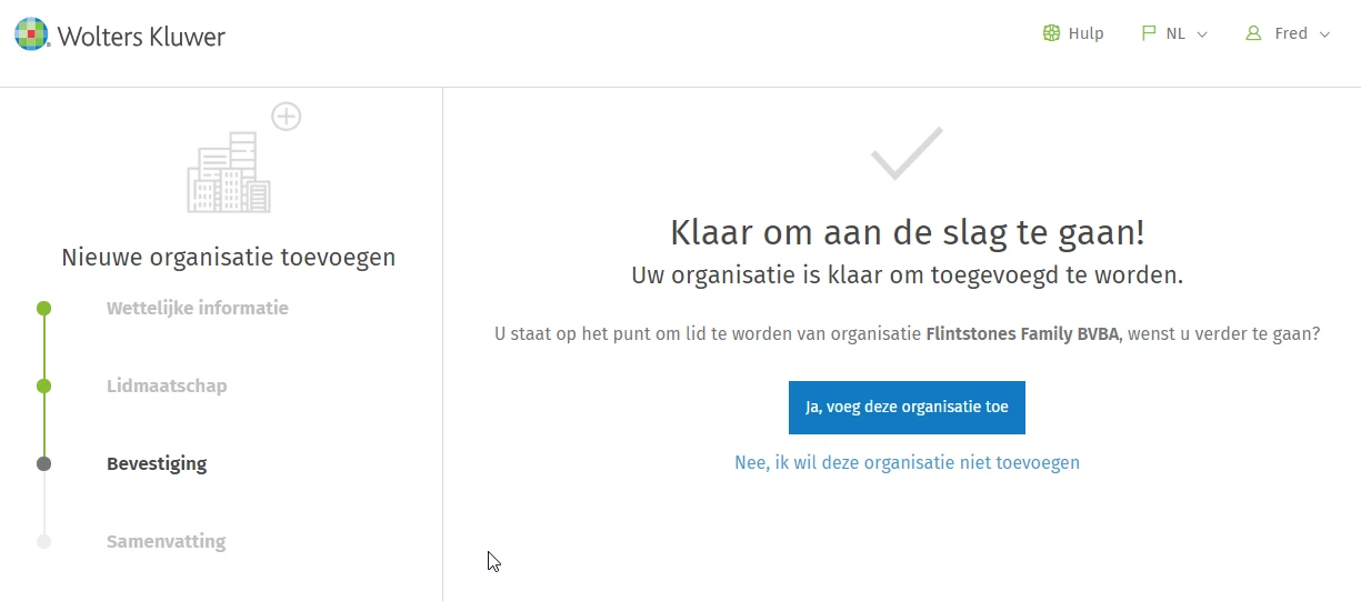 - U bent de eerste die deze organisatie koppelt en u kunt direct de organisatie toevoegen.