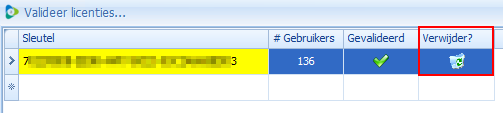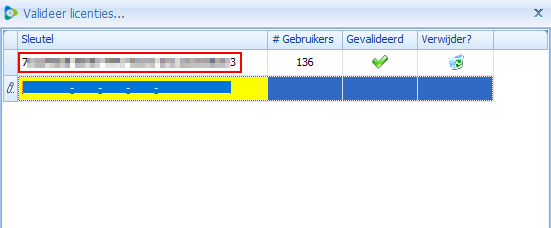 Vul in het venster ‘Valideer licenties…’ uw licentiesleutel in in het eerst volgende lege vak (in het kolom ‘Sleutel’) en klik tot slot op Enter. U zult merken dat, mits een geldige licentie, deze zal worden gevalideerd en het aantal gebruikers zal worden weergegeven: