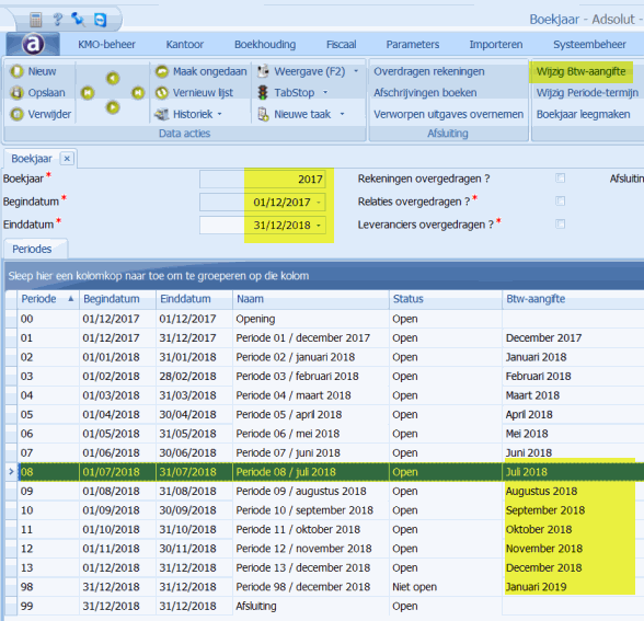 Als u niets heeft geboekt in het nieuwe boekjaar en u kan toch de periode niet wijzigen, dient u na te kijken als het nieuwe boekjaar ook niet werd aangemaakt in het dagboek. Deze dient u dan in ieder dagboek te wissen.