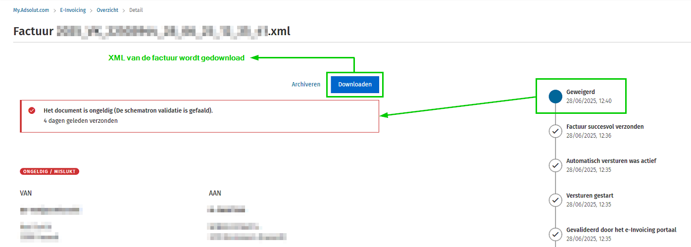 De Peppol factuur wordt dan Geweigerd of Ongeldig.