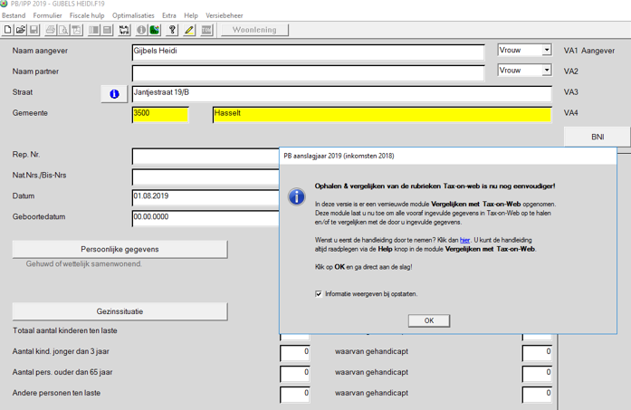 Vervolgens wordt Personenbelasting opgestart met de gegevens uit Adsolut (situatie burgerlijke staat, partner en gezinssituatie op 01/01/<aanslagjaar>) en een nieuwe aangifte geopend.