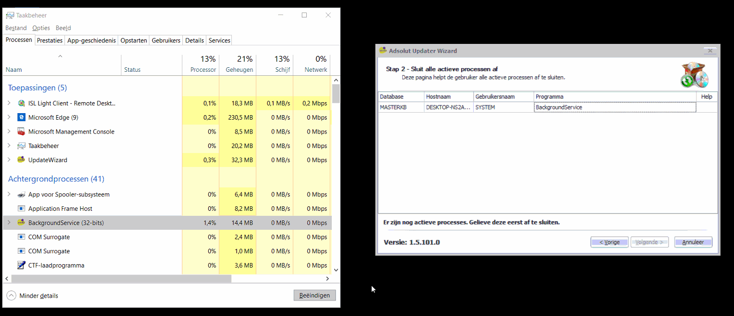 Tijdens het updaten van Adsolut verschijnt de melding: Er zijn nog actieve processen. Gelieve deze eerst af te sluiten.